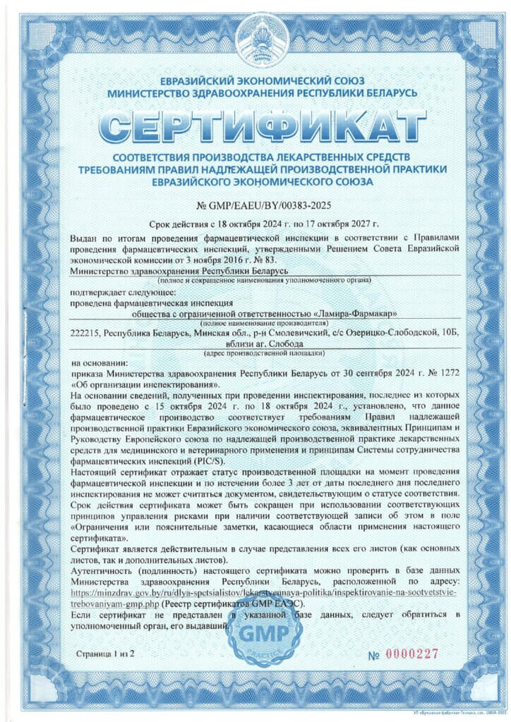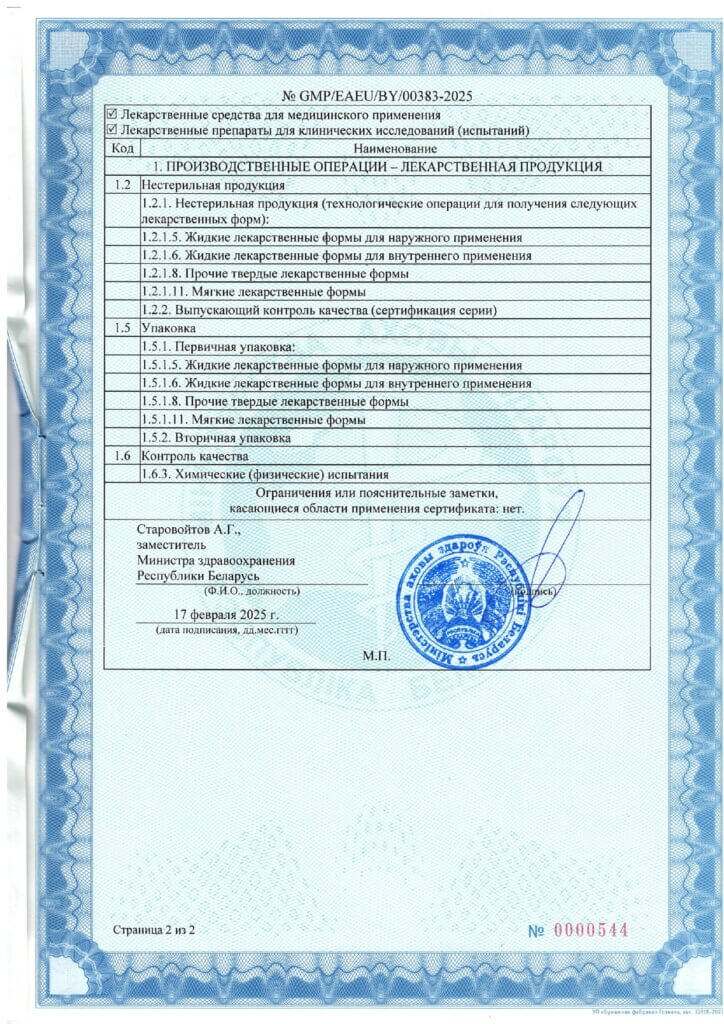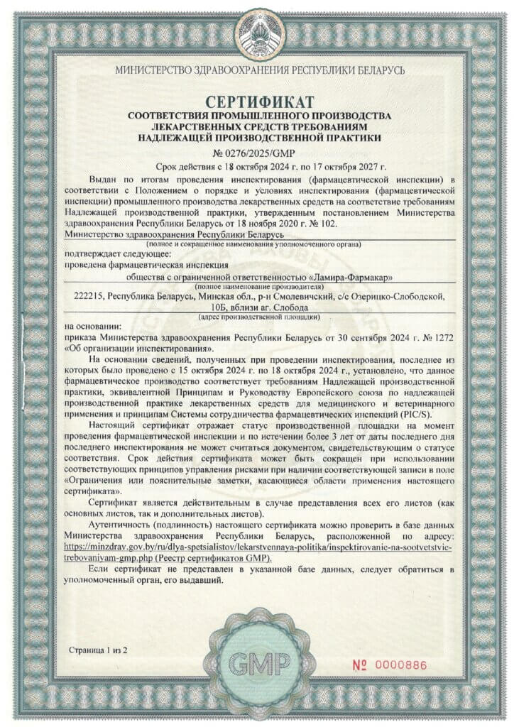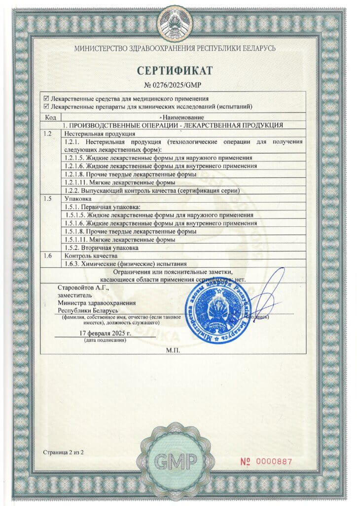 Деятельность по промышленному производству и вторичной упаковке лекарственных средств осуществляется в соответствии с требованиями Надлежащей производственной практики (GMP), утвержденной постановлением Министерства здравоохранения Республики Беларусь от 18 ноября 2020 г. № 102.