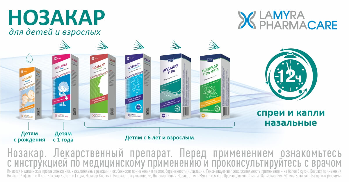 Спреи и капли назальные Нозакар содержат деконгестант оксиметазолин. Линейка лекарственного препарата Нозакар представлена формами выпуска с различной концентрацией оксиметазолина для применения в зависимости от возраста пациента.